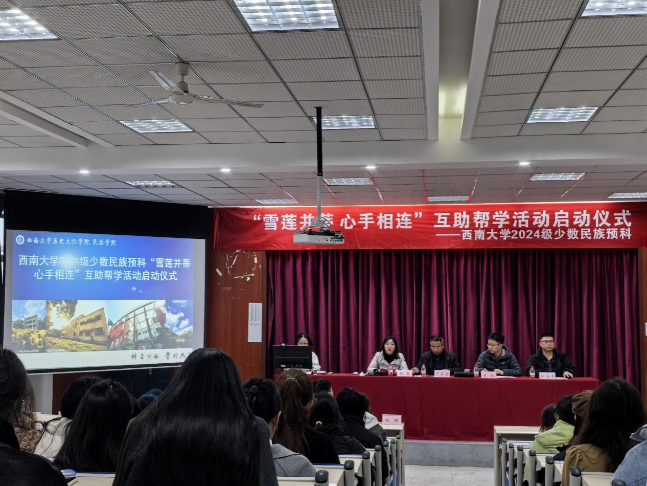 2024级少数民族预科"雪莲并蒂 心手相连"互助帮学活动启动仪式在荟文楼442举行。学院党委书记罗庆昌、党委学生工作部副部长、学生工作处副处长、武装部副部长朱凯、学院党委副书记张静、学院副院长陈永亮出席,预科班主任张哲鉴老师、辅导员亚库普、纪蝶老师以及全体2024级少数民族预科学生参加。活动由学院党委副书记张静主持。