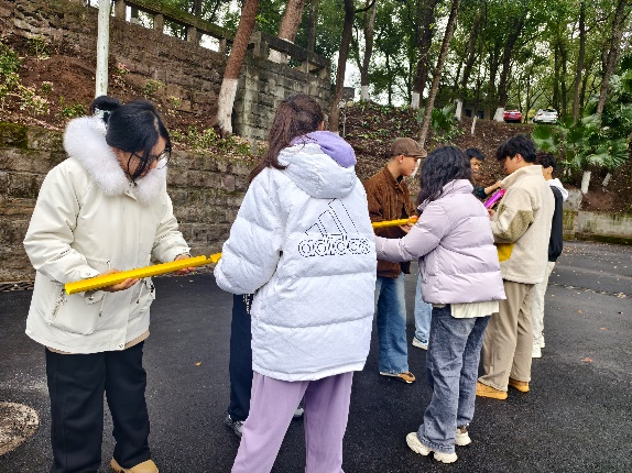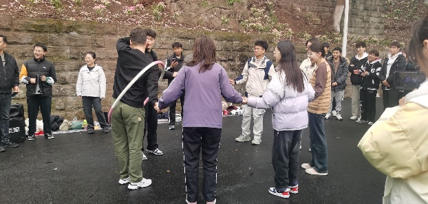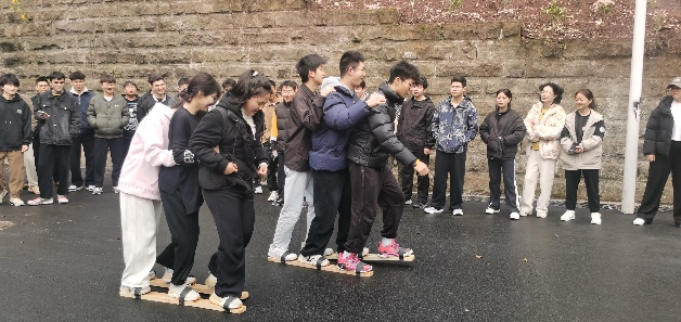 随后各个项目依次开展,“一圈到底”中,参赛者们紧密地排成一列,宛如一条灵动的长龙。呼啦圈在成员间轻盈地穿梭,依次传递给下一位成员。“同舟共济”项目上,队员们共同穿上特制的“木鞋”艰难竞速。他们步伐一致,口号响亮,每一步都迈得坚实有力。