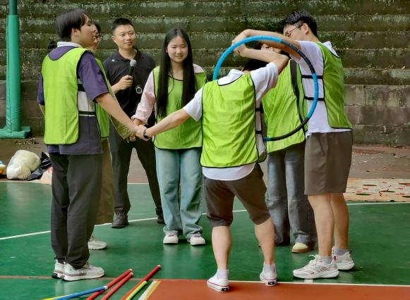 在紧张激烈的游戏环节中,各项目环环相扣、精彩纷呈。“勇攀高峰”项目中两支队伍皆沉稳应对,以精密分工与默契配合稳步推进。“重走长征路”项目既考验了团队成员的细致与耐心,更让成员们在模拟长征征程中感悟风雨同舟、不怕挫折的深刻内涵。“惊喜连连看”项目中队员通过准确沟通、精准执行,彰显了团队协作的智慧。压轴的“勇夺第一”接力赛将活动推向高潮,“一圈到底”“移花接木”“团队节拍”,三个环节层层递进,全方位考验了团队的统筹规划能力。