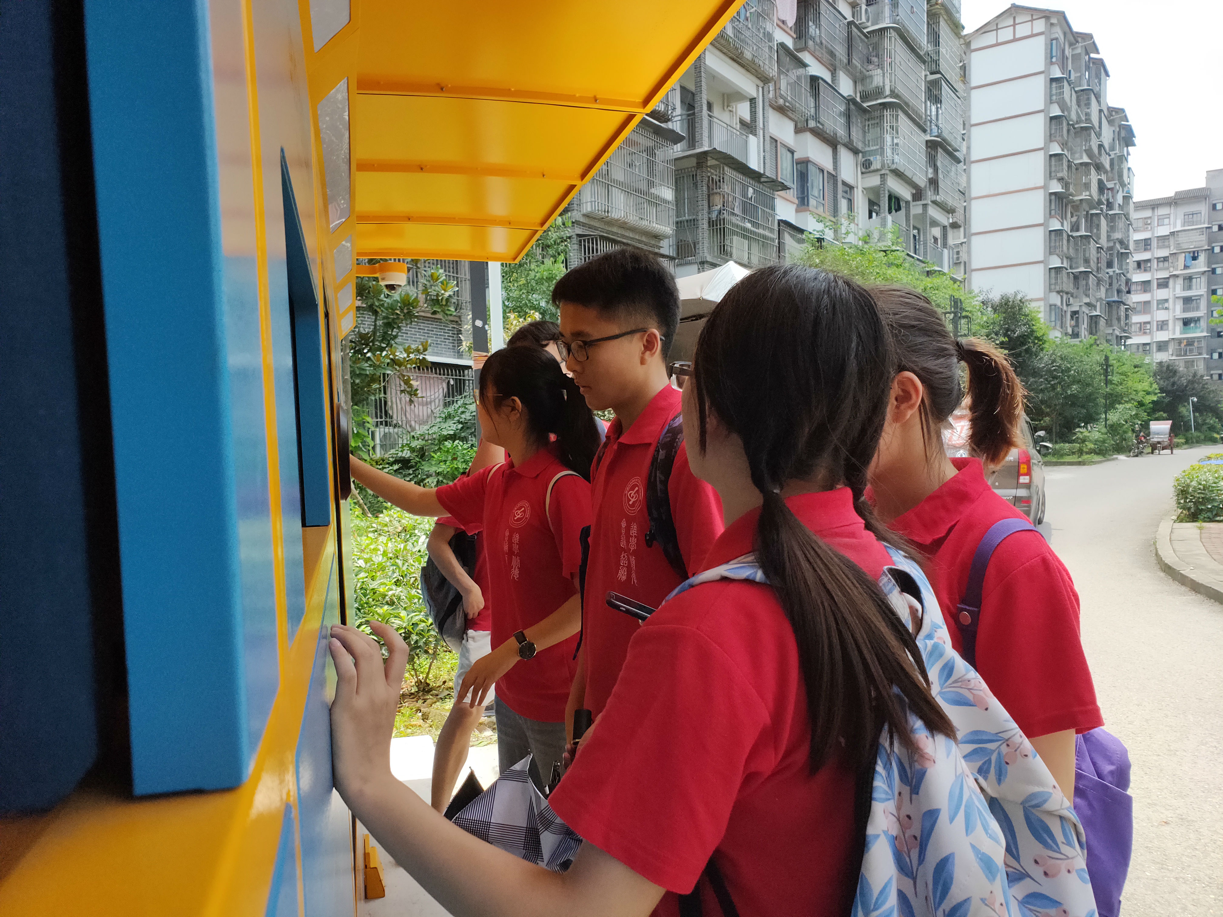 结束当天的问卷调查之后,志愿者们再到社区考察,发现了智能垃圾分类回收箱,算得上是当天的重大发现。通过志愿者们的了解,智能垃圾分类回收箱分为五大类,有纸类回收、纺织物回收、金属回收、塑料回收、玻璃和有害垃圾回收。操作栏为全触屏电子幕,显示着每种回收品类型的投递价格,分为儿童模式和成人模式。小队组长王梓璇现场下载了“小黄狗”APP,在回收机上选择投递的品类,打开APP扫描二维码,按要求把物品投进回收箱,获得了0.02元的收益。志愿者们一致认为这种垃圾回收的方式可以激发大家垃圾分类回收的热情,养成垃圾分类的好习惯。