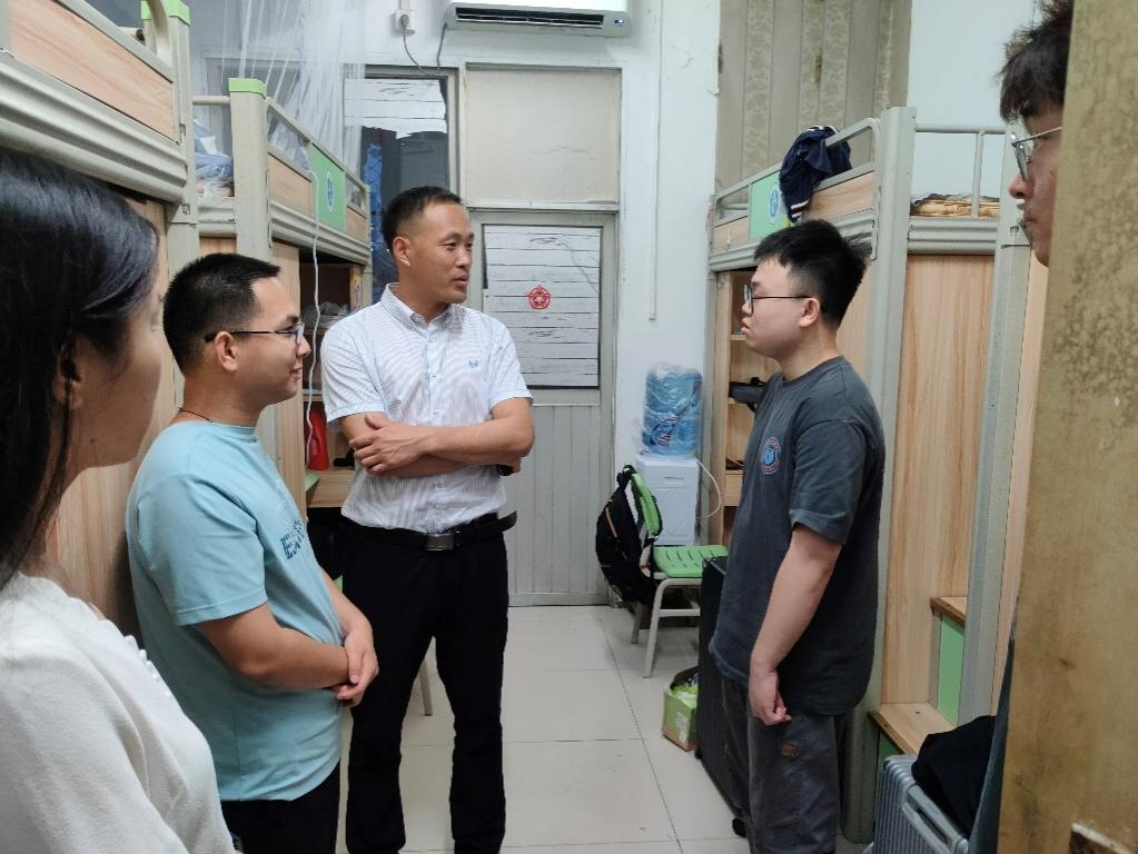 为做好新生接待工作,切实了解新生入住情况,9月10日晚,学院全体领导班子成员、新生辅导员、学院研究生会和团学组织干部分成4组全覆盖走访了2023级研究生、本科、预科共计117间新生寝室。