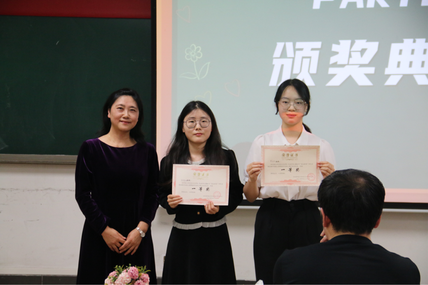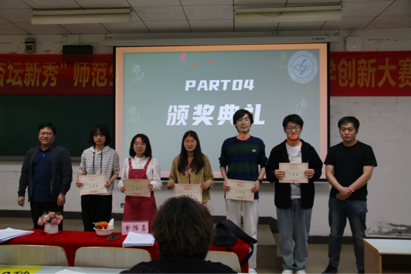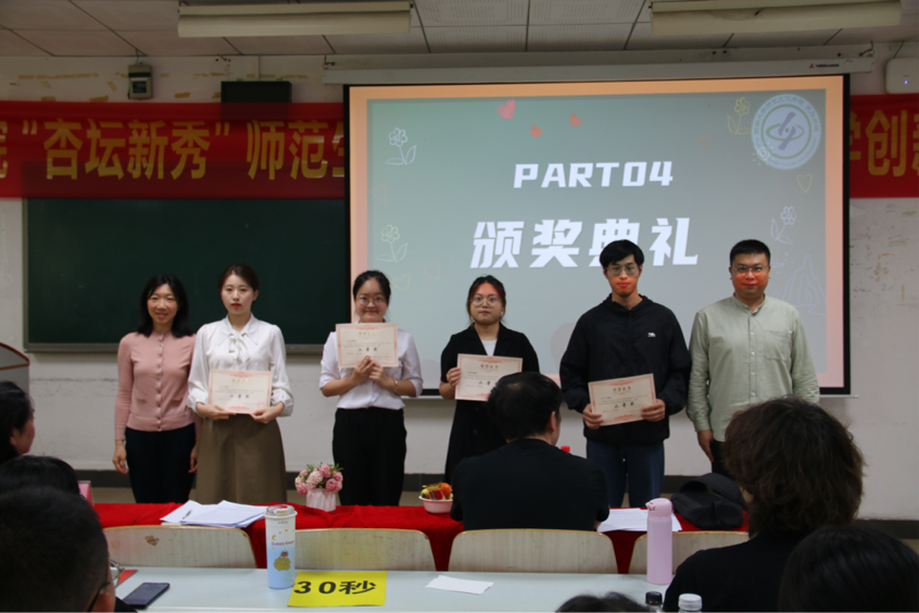 经过激烈的角逐,公布大赛的名次,一等奖选手:陶艳琳、黄自然。二等奖选手:张震宇、邱麟越、宋菲、邹宛馨。三等奖选手:周靖星、谢雨杰、李双红、高阳梓璟、赵悦彤、刘尊。评委和嘉宾老师们为获奖选手颁奖。最终,一等奖获得者陶艳琳、黄自然两位同学将代表学院参加学校第十六届师范生课堂教学技能大赛暨第三届"师元杯"教学创新大赛。