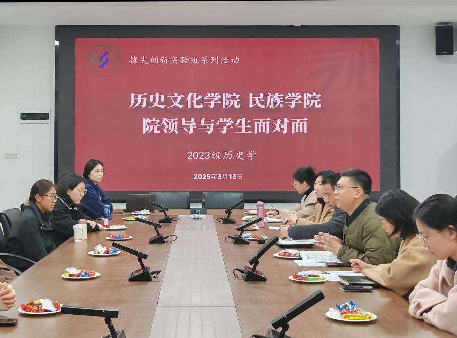 在同心楼207会议室举办"院领导与学生面对面"座谈会。学院党委书记罗庆昌、党委副书记张静、副院长陈永亮、教务办主任蒋朴以及2023级辅导员高倩与历史学拔尖创新实验班学生深入交流,共话人才培养与学业发展。