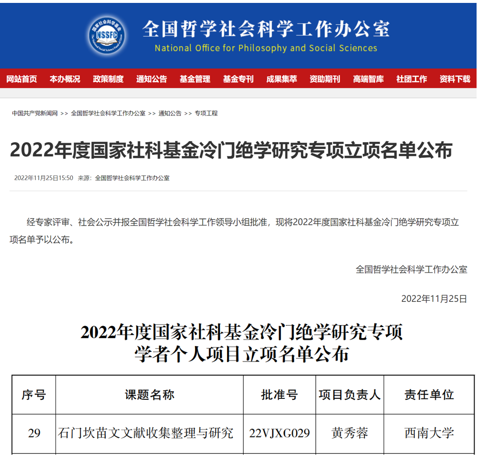 黄秀蓉老师的《石门坎苗文文献收集整理与研究》(批准号22VJXG029)获批学者个人项目。