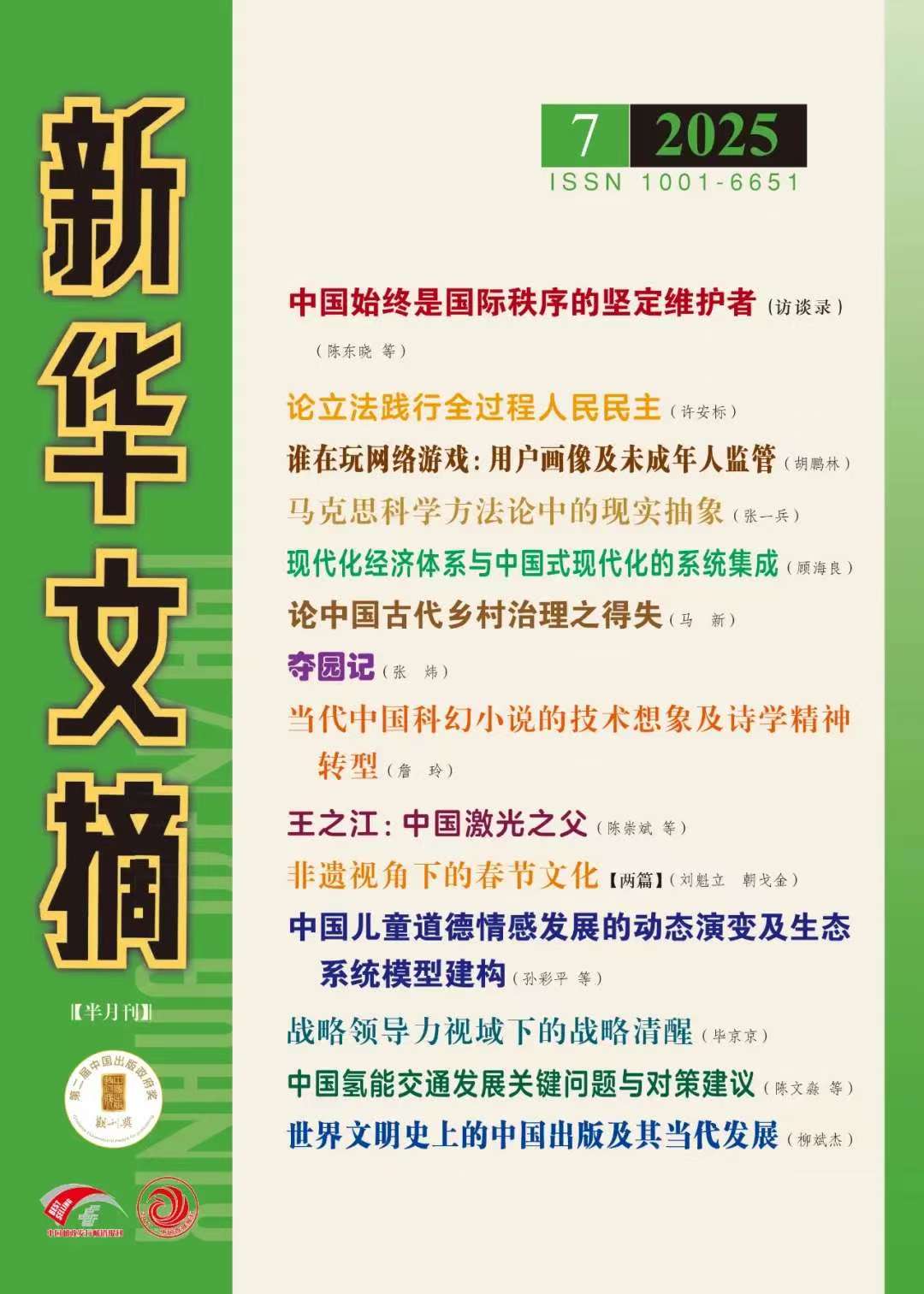 《新华文摘》由国家新闻出版署主管、人民出版社主办、新华文摘杂志社编辑出版,是大型理论性、综合性、资料性文摘类权威期刊。