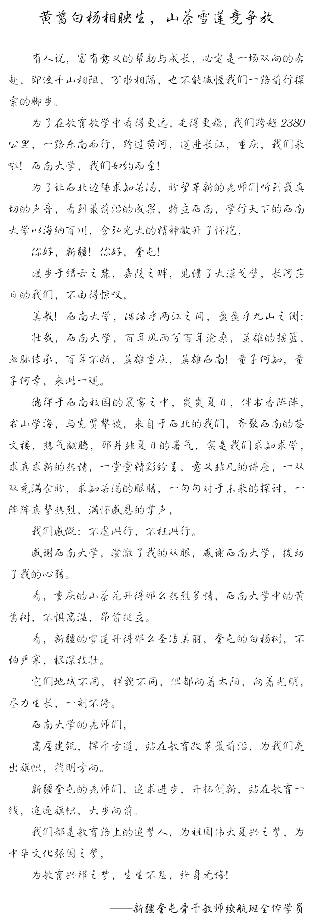 “渝奎情不老,续航不散场”。此次的续航学习,是高校与基础教育领域的一场灵魂交流,是壮丽重庆与大美新疆的一场精彩对话。新疆奎屯市骨干教师培训班全体学员将心怀感恩之心,从这里再启航、再出发!