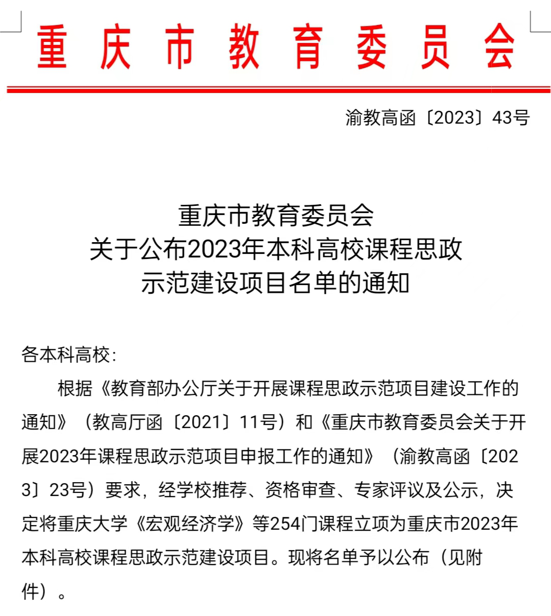 已获批国家级课程思政示范课程1门,国家级课程思政教学名师1人、教学团队1个,重庆市课程思政示范课程3门,重庆市课程思政教学名师3人、教学团队3个。重庆市课程思政示范教学案例1个。