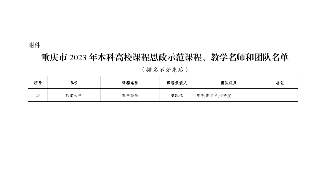 2023年7月18日,重庆市教育委员会正式公布了2023年本科高校课程思政示范建设项目名单。学院《藏学概论》课程入选重庆市课程思政示范课程,曾现江教授入选重庆市课程思政教学名师,《藏学概论》教学团队入选重庆市课程思政示范教学团队。