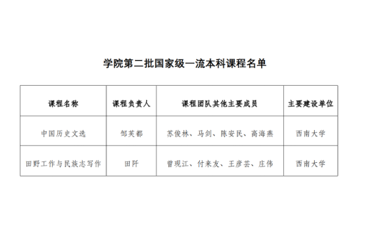 邹芙都教授领衔的《中国历史文选》(线下课程)、田阡教授领衔的《田野工作与民族志写作》(社会实践课程)被认定为国家级一流本科课程。