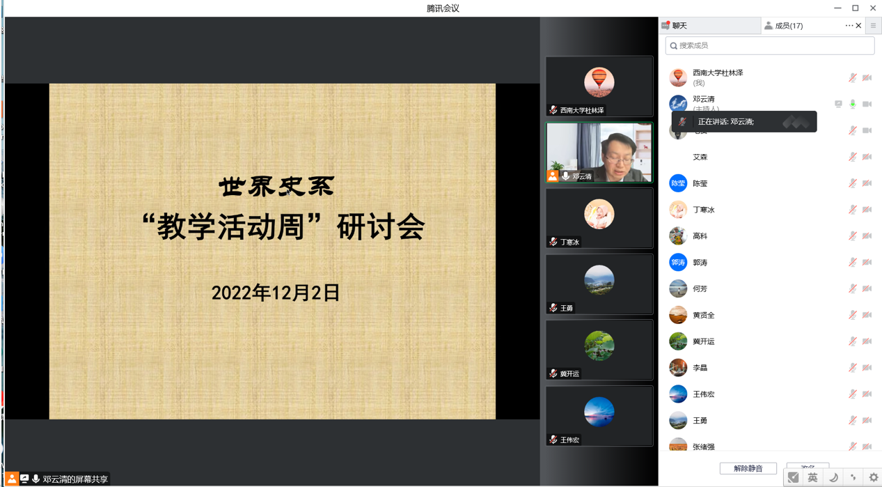 世界史系组织召开本学期“教研活动周”研讨会。世界史系全体教师相聚云端,交流探讨教学工作。会议由世界史系主任邓云清教授主持。