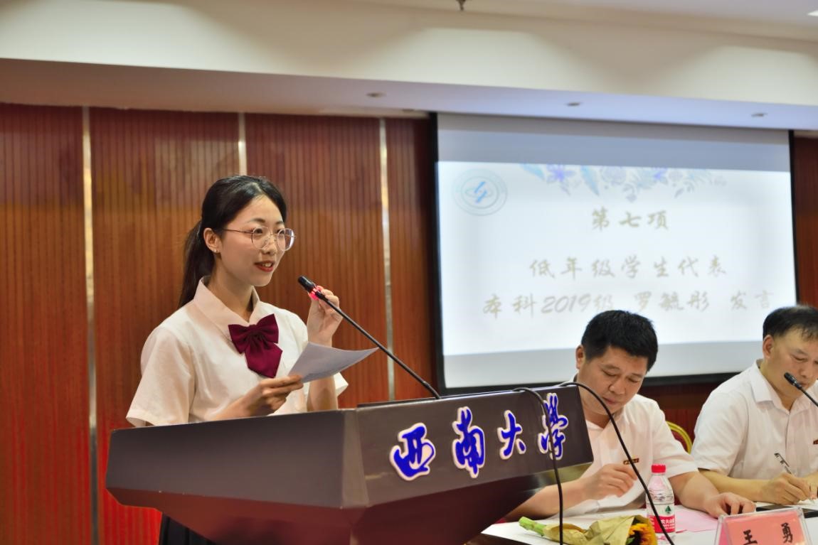 低年级学生代表、本科2019级罗毓彤同学为全体毕业生学长学姐送出了真挚祝福。她代表学院全体低年级同学表态,将弘扬2022届毕业生的优良传统,不断锤炼自身本领,继续为学校和学院争光。