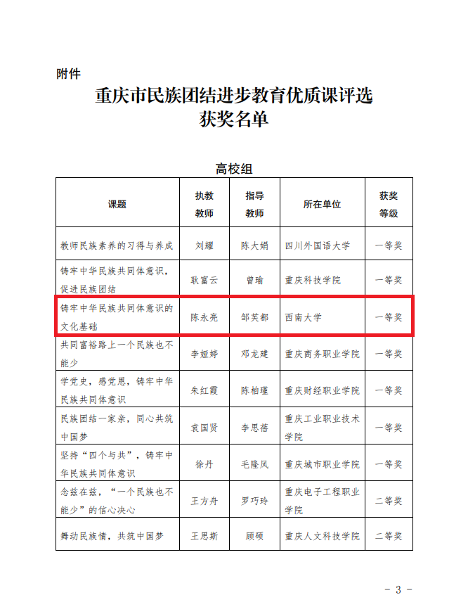近日,重庆市教育委员会公布了民族团结进步教育优质课评选获奖情况,学院青年教师陈永亮主讲、邹芙都教授指导的“铸牢中华民族共同体意识的文化基础”一课获高校组一等奖(全市共七节)。