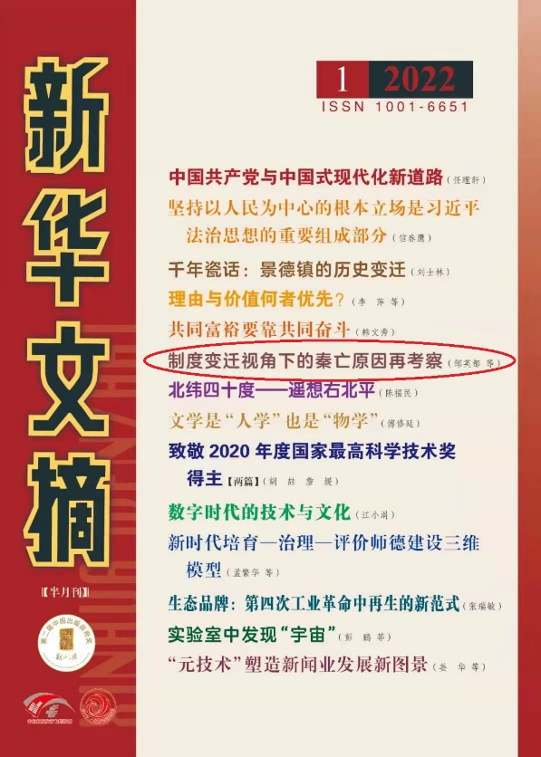 近日,《新华文摘》2022年第1期出刊,邹芙都教授等《制度变迁视角下的秦亡原因再考察》(原刊于《中州学刊》2021年第10期,约18000字)一文作为封面文章被《新华文摘》长文转载。