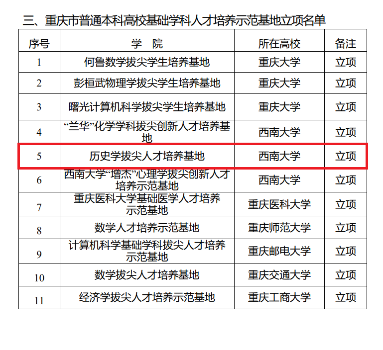 近日重庆市教育委员会、重庆市财政局公布了重庆市普通本科高校示范性新型学院(基地)的入选名单。学院“历史学拔尖人才培养基地”作为基础学科人才培养示范基地成功立项,是91porn