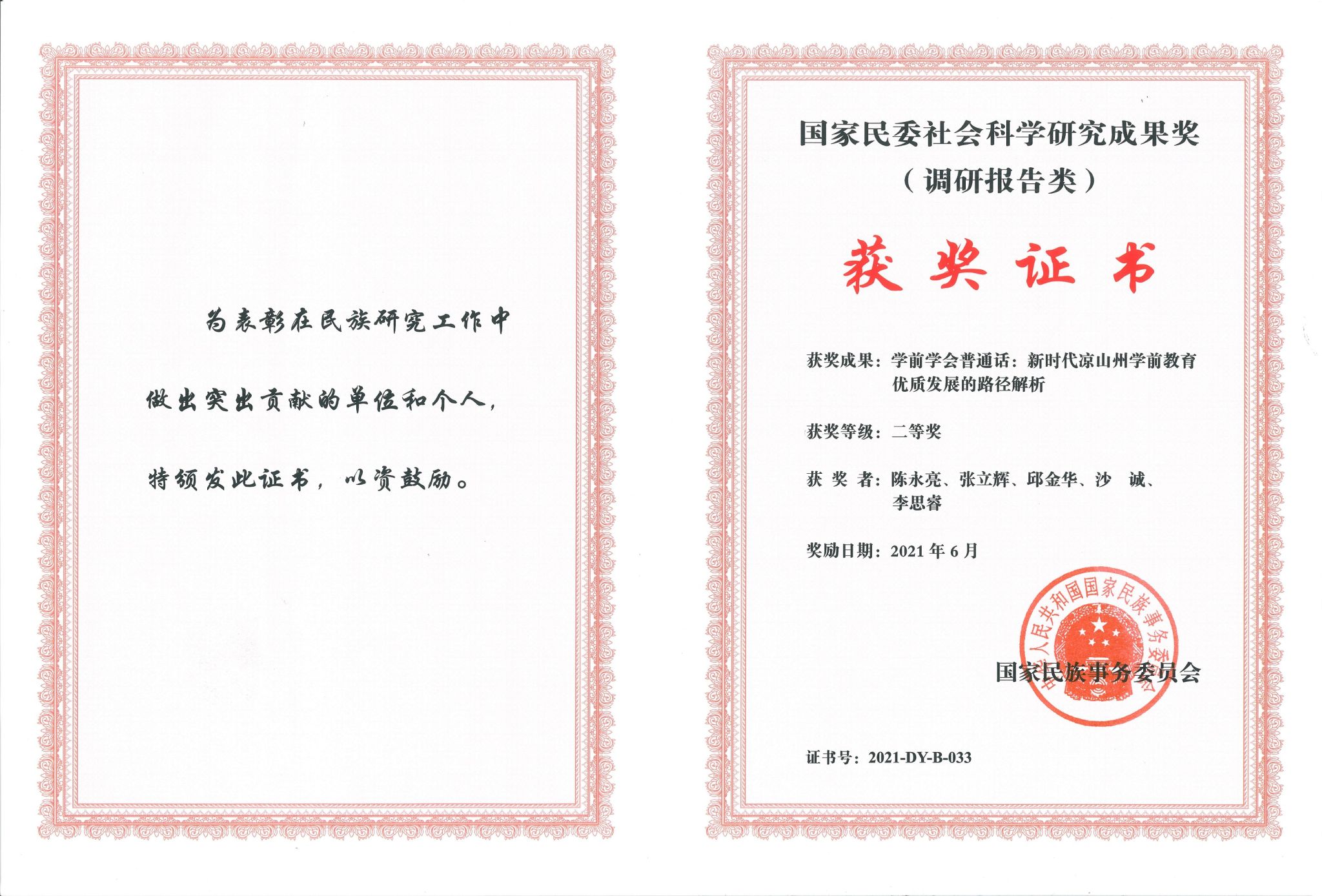 近日,2020年度国家民委社会科学优秀成果评选结果揭晓,91porn 教师陈永亮等撰写完成的《学前学会普通话:新时代凉山州学前教育优质发展的路径解析》,荣获国家民委社会科学研究成果奖(调研报告类)二等奖,展示出我校在民族研究领域的优势。