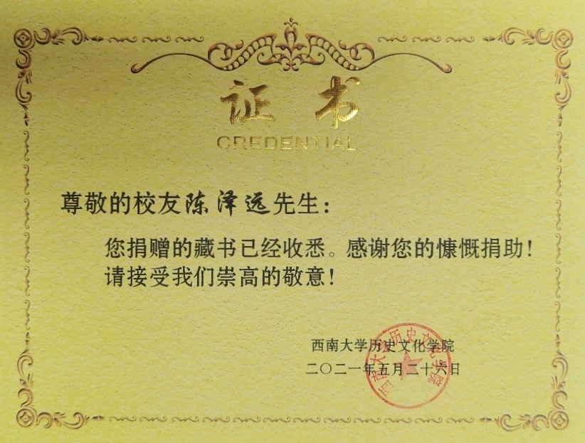 资料室捐赠图书一套。陈泽远先生的赠书开拓了同学们的视野,丰富了大家的精神生活,充裕了资料室藏书资源,为学院的发展添砖加瓦。