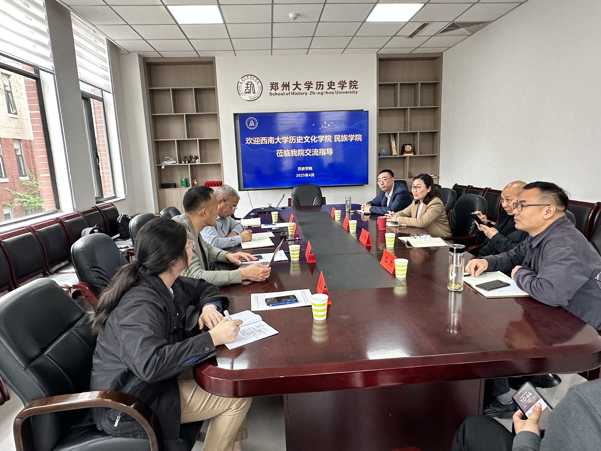 4月9日上午,学院一行4人在郑州大学历史学院考察调研。郑州大学历史学院党委书记王琛、党委副书记张研、副院长吴志远、巴杰、办公室主任王宇谦出席座谈会。座谈会由党委书记王琛主持。