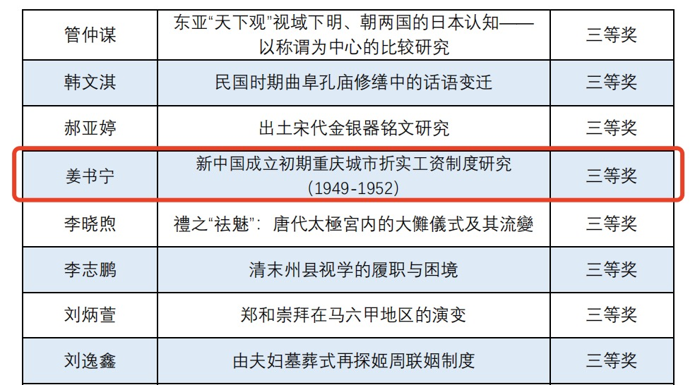 2023级博士研究生姜书宁的论文《新中国成立初期重庆城市折实工资制度研究 (1949-1952)》获三等奖。