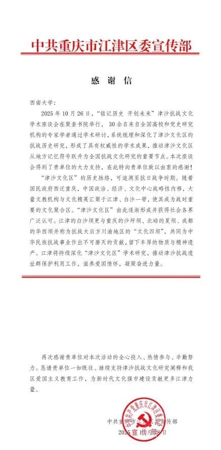 信中指出,30余名来自全国高校和党史研究机构的专家学者通过学术研讨,形成了具有权威性的学术成果,推动津沙文化区从地方记忆符号跃升为全国抗战文化研究的重要节点。信中还回顾了“津沙文化区”的重要历史地位。抗日战争时期,随着国民政府西迁重庆,国家政治、经济、文化中心战略性内移,大量文教机构与文化精英汇聚于江津、白沙一带,使该区域成为战时重要的文化聚合区,并逐渐形成得到社会各界广泛认可的“津沙文化区”。江津的白沙坝更与重庆的沙坪坝、北碚的夏坝、成都的华西坝并称为抗战大后方川渝地区的“文化四坝”,为中华民族的抗战事业作出了不可磨灭的贡献,留下了丰厚的物质与精神遗产。