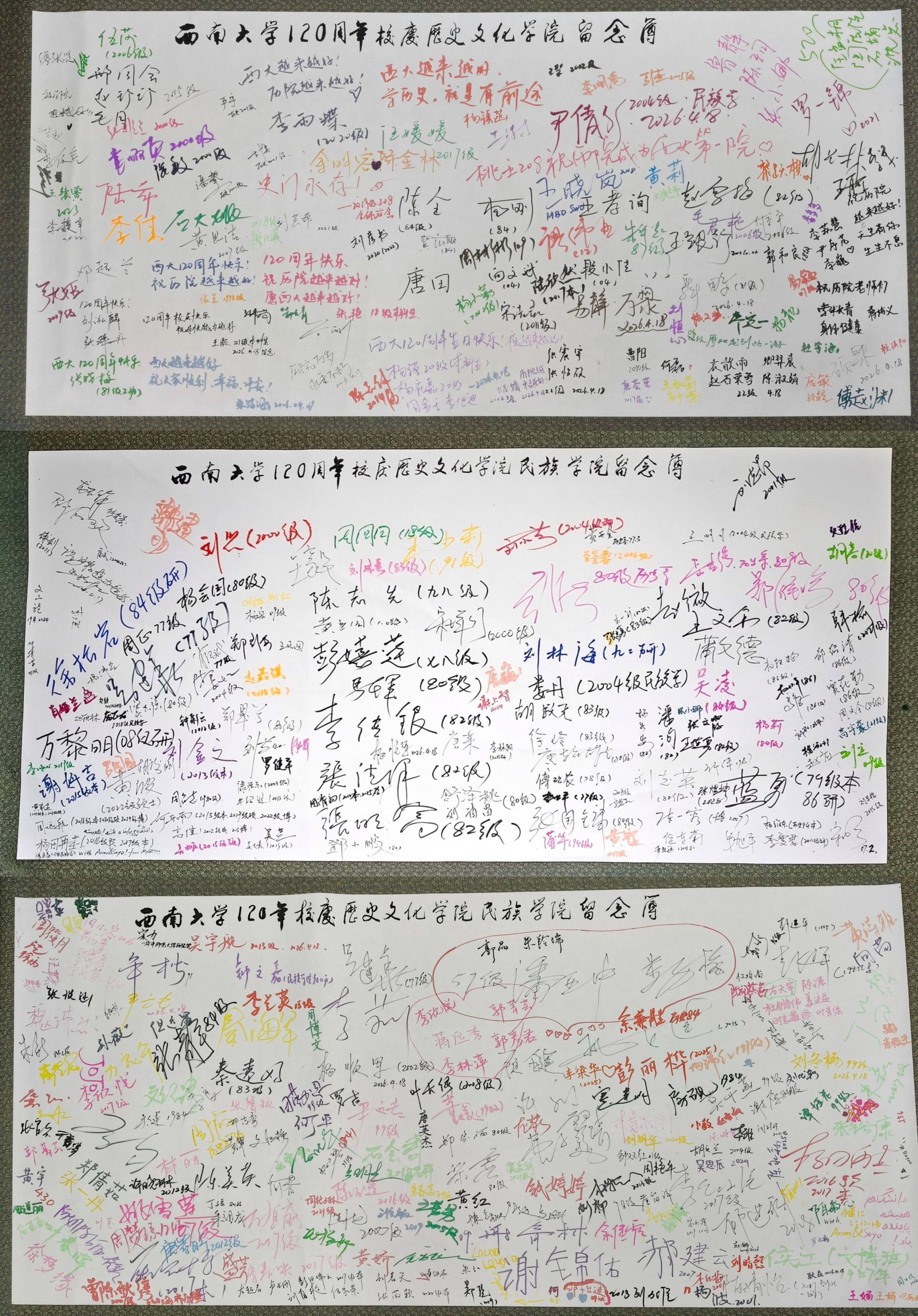 陆续迎来各届校友五百余人荣返母院。学院大厅装扮得喜庆温馨,相机定格下一张张灿烂的笑脸,一批批满怀思念与激动的毕业生相继归来,处处洋溢着热烈而亲切的团聚氛围。校友们纷纷在纪念簿上郑重签名、题写祝福,“祝母校生日快乐”“我永远热爱西大”“愿母院越办越好”“感恩母校,铭记师恩”……一句句发自肺腑的真情告白,道出了对母校与学院的深厚情谊和浓浓祝福。