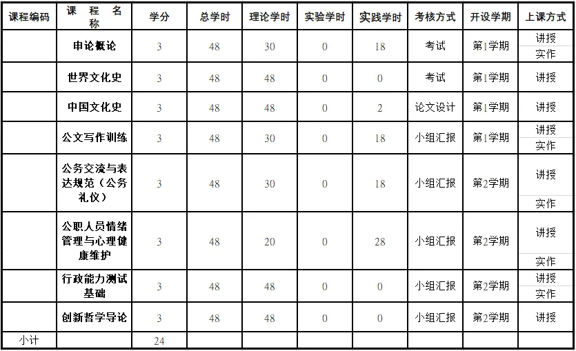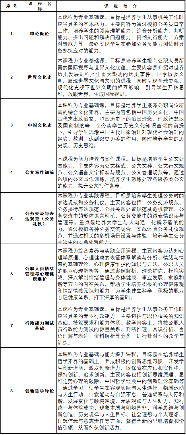 学期:两学期。第一学期开展文化基础课程教学,包括申论概论、世界文化史、中国文化史、创新哲学导论等课程;第二学期开展素质拓展与能力培养课程教学,包括行政能力测试基础、公文写作、公务交流与表达规范(公务礼仪)、公职人员情绪管理与心理健康维护等课程。