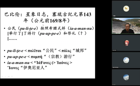 讲座的第一部分,徐教授将古希腊文献与中国古代典籍进行对比,指出司马迁《史记》的《大宛列传》中记载的古地名能够与古代西方文献的地名相互对应,《大宛列传》中对域外的描写体现的是当时希腊化世界的政治和文化特征。丝绸之路的大部分路段都穿行于希腊化世界当中,因此,沿线城市同时具备希腊化和丝路文化的双重特征。徐教授引用了同一时期巴比伦星象日记的记载和更晚一些的乌鲁克神庙铭文,进一步说明希腊文化对丝路沿线城市的影响并未随着希腊—马其顿人政权的颠覆而终止,因此,希腊语和希腊文化能够成为理解和推进中西交通研究的知识背景。