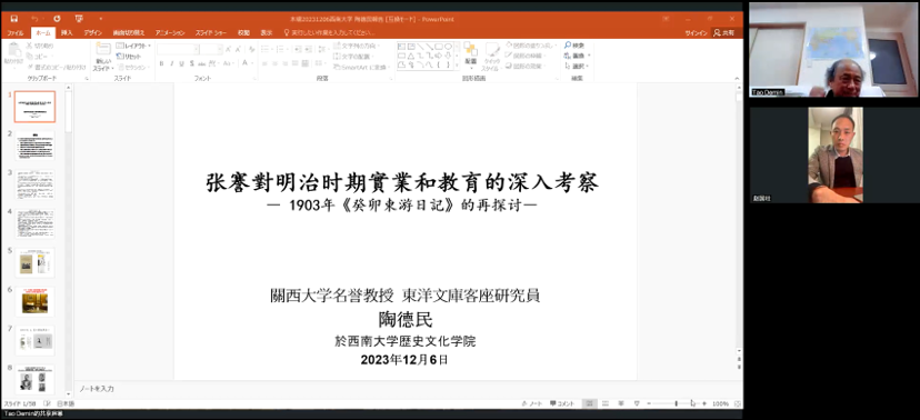 进入讲座主题后,陶德民教授讲述了从发现内藤湖南所藏张謇书简、研读张謇《癸卯东游日记》等史料的契机和心得。陶教授接着详细介绍了张謇东游日本的契机、过程、见闻和思考,认为张謇考察颇具良苦用心,对日本近代化有深刻的反思。陶教授指出,张謇东游日本期间的谦逊态度和敏锐分析,在清末中国官民对日考察活动中实属罕见;而张謇的考察时段,恰好处于日本在经贸推动下,影响中国文化与政治的历史时期,他认为,当时中国江楚地区与日本关西地区之间,存在一个隐形的交流圈。
