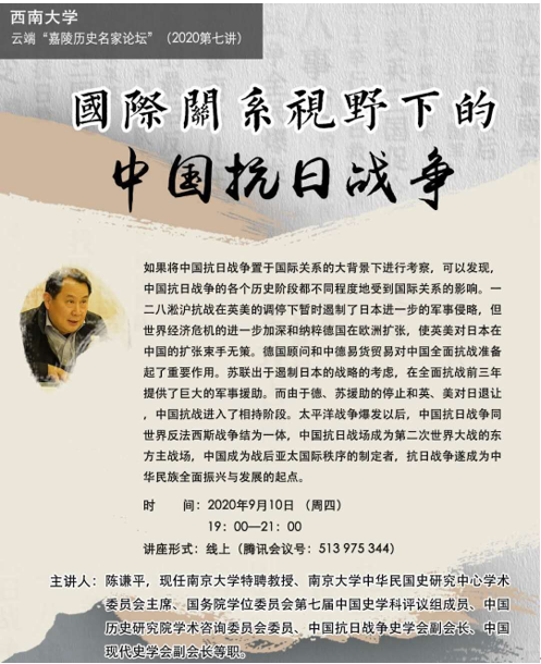陈谦平教授长期致力于中华民国史研究工作,其研究领域涵盖“中华民国”时期政治、经济、军事和对外关系等方面,著有《抗战前后之中英西藏交涉(1935—1947)》、《民国对外关系史论(1927—1949)》、《西藏百年史研究(中册)》等,在《历史研究》《近代史研究》等知名期刊发表数十篇论文,承担国家社科基金重大项目。本次讲座陈教授今结合年抗日战争胜利七十五周年纪念的主题,拟从国际关系的视野的角度讨论抗日战争。