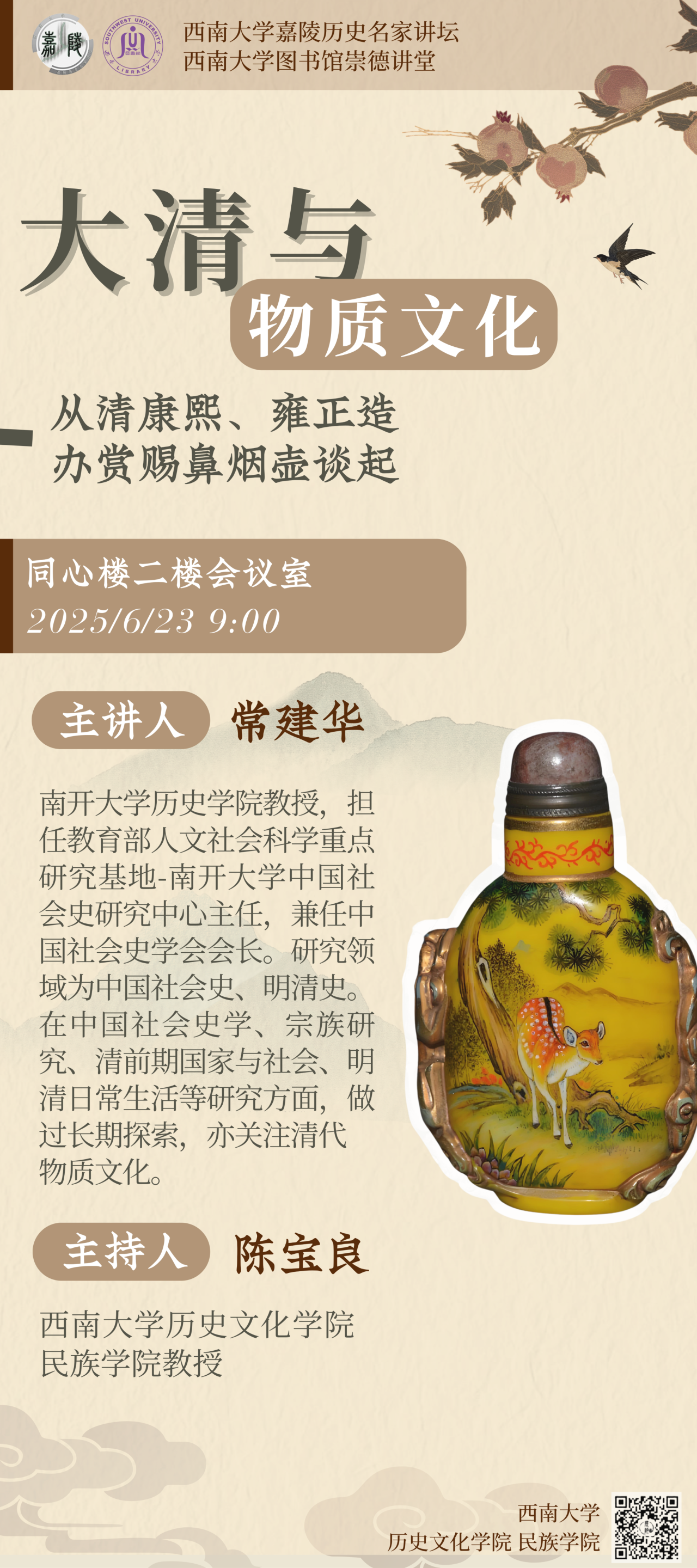 三、主讲人常建华。南开大学历史学院教授,担任教育部人文社会科学重点研究基地-南开大学中国社会史研究中心主任,兼任中国社会史学会会长。研究领域为中国社会史、明清史。在中国社会史学、宗族研究、清前期国家与社会、明清日常生活等研究方面,做过长期探索,亦关注清代物质文化。